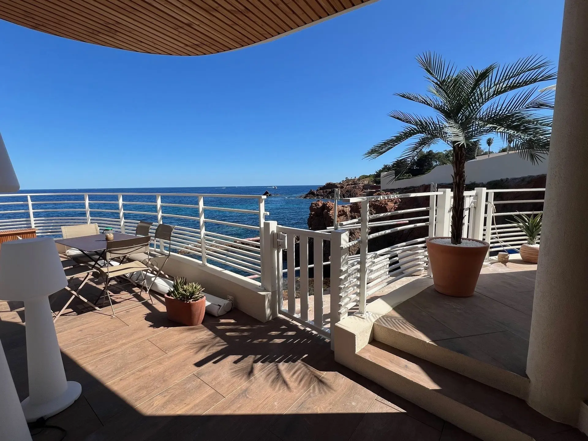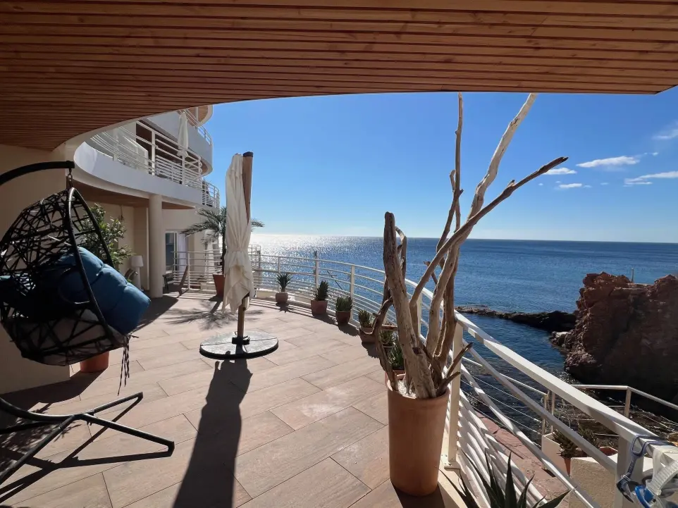 Surplombant la mer tel le pont d'un navire, la terrasse panoramique, dotée de deux accès directs à la mer, bénéficie d'un emplacement exceptionnel et d'un ensoleillement incomparable.