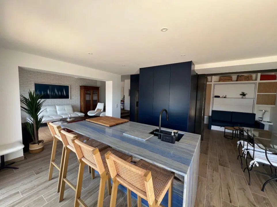 Dès l'entrée dans le séjour, vous serez captivé par le bleu marine des meubles de la cuisine et par le monobloc en quartzite bleu Macaubas de l'îlot central, qui semble être un prolongement naturel de la mer en contrebas.