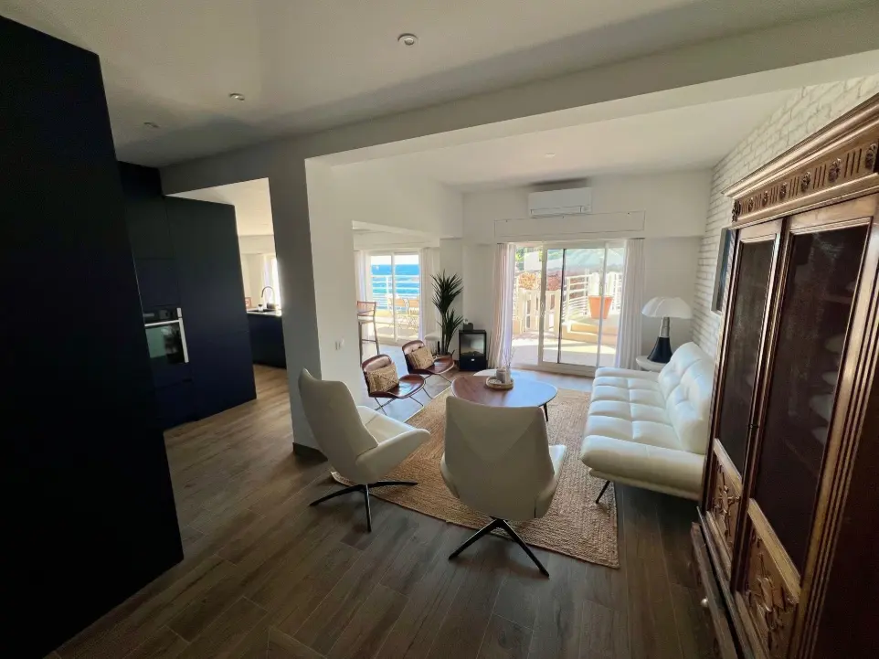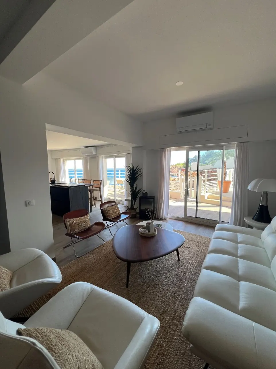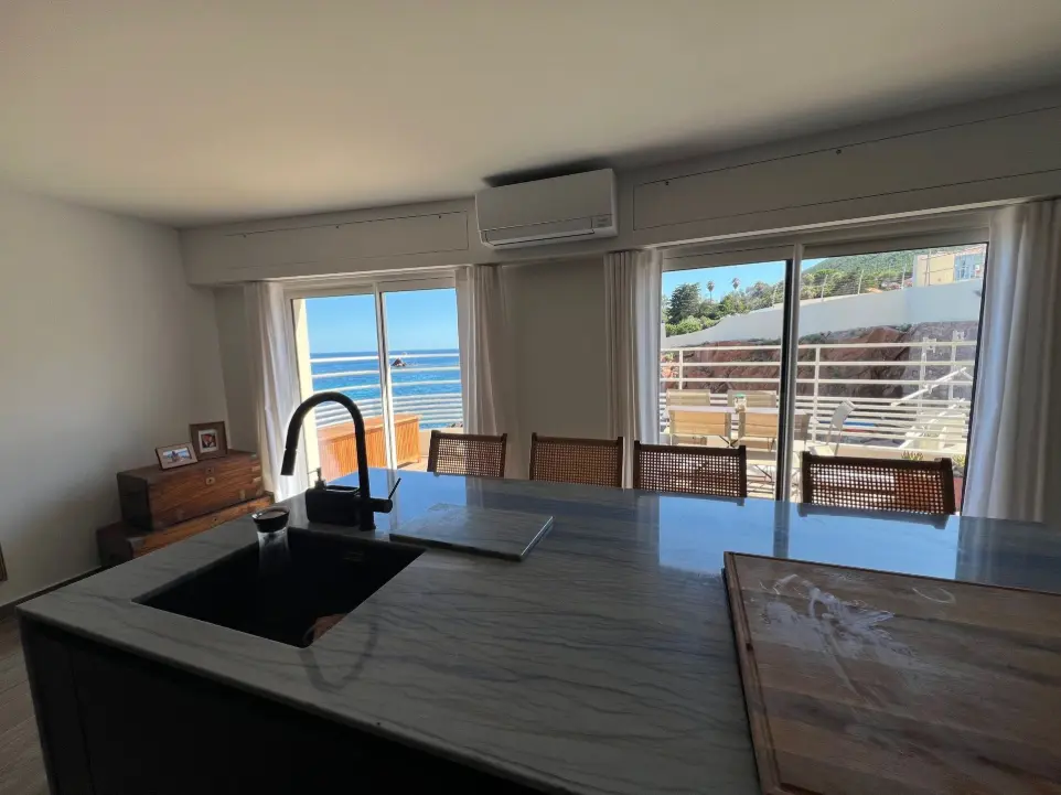 Laissez-vous séduire par ce vaste salon/cuisine de plus de 60 m², ouvrant directement sur la mer avec son espace de vie baigné de lumière.